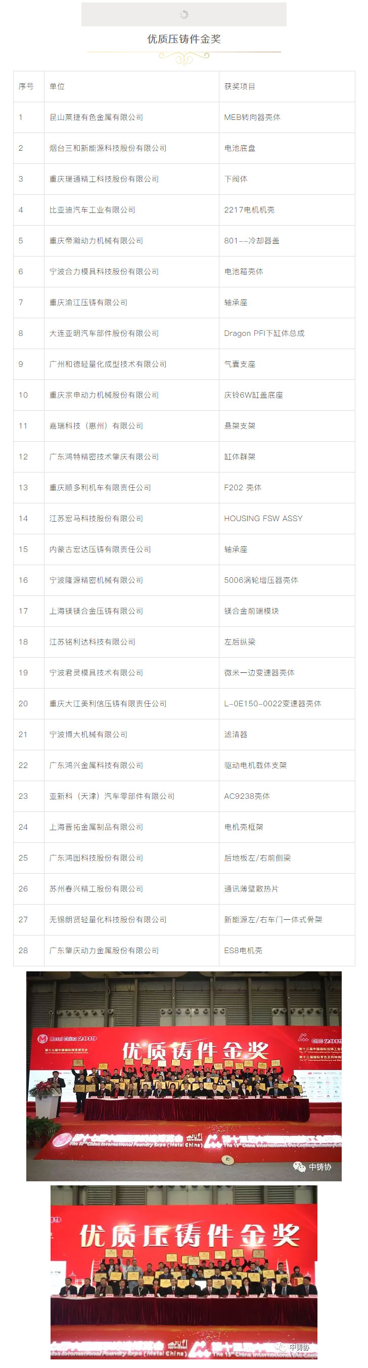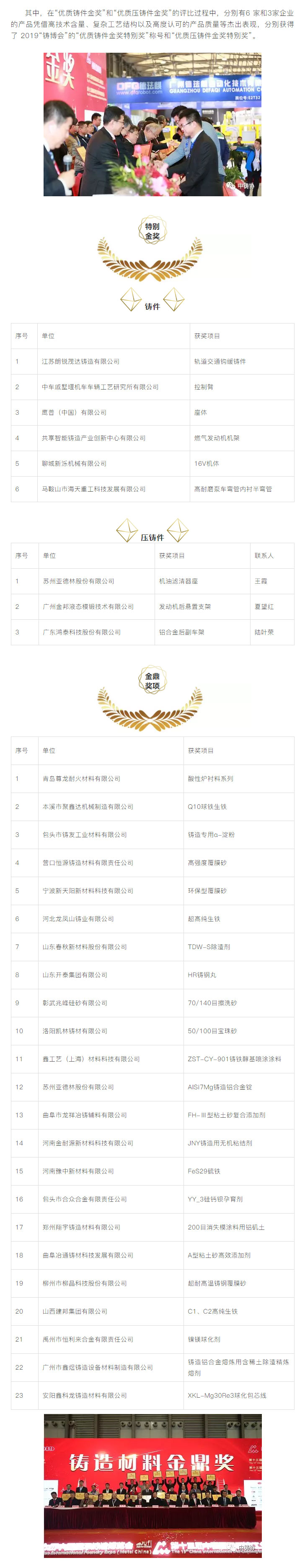 為了進(jìn)一步鼓勵(lì)鑄造行業(yè)科技創(chuàng)新,推動(dòng)鑄造行業(yè)質(zhì)量工作,更好地服務(wù)于鑄造行業(yè)轉(zhuǎn)型升級(jí),本著“評(píng)先獎(jiǎng)優(yōu)”’的原則,中國鑄造協(xié)會(huì)在“第十七屆中國國際鑄造博覽會(huì)”及“第十三屆中國國際壓鑄工業(yè)展覽會(huì)”期間,繼續(xù)對(duì)參展的鑄件、壓鑄件、鑄造裝備、鑄造材料、藝術(shù)鑄品及四新技術(shù)開展了評(píng)比活動(dòng)。本次評(píng)選活動(dòng)得到廣大參展商的大力支持,共有154家企業(yè)的200余件展品參與申報(bào)評(píng)優(yōu)。